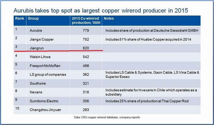 日前,英國商品研究所(簡稱:CRU)發(fā)布了全球銅桿生產(chǎn)商排名,江潤銅業(yè)位列第三。 英國商品研究所是礦產(chǎn)、金屬、電線電纜等行業(yè)內(nèi)世界領先的權威分析機構(gòu),總部位于倫敦,全球擁有各國專家超過250人,包括經(jīng)濟學家、管理顧問、工程師、冶金學家、地質(zhì)學家、化學家及媒體從業(yè)人員。多年來,英國商品研究所作為世界知名的金屬市場分析及咨詢公司,以其獨立性和權威性得到行業(yè)內(nèi)的廣泛認可,其分析報告和數(shù)據(jù)統(tǒng)計被行業(yè)內(nèi)普遍采用和參考。公司擁有兩條年產(chǎn)35萬噸SCR-7000銅連鑄連軋生產(chǎn)線,2015年生產(chǎn)銅桿62萬噸;深加工裸銅線25萬噸、鍍錫銅線2萬噸、束絞銅線6萬噸。江潤銅業(yè)專心、專業(yè)、專注于銅導體研發(fā)制造領域近四十年,未來將繼續(xù)秉承“一流裝備技術、一流產(chǎn)品服務、一流客戶市場”的經(jīng)營理念,以信致遠、以精至臻,穩(wěn)健、進取的核心價值觀,踐行工業(yè)理想,肩負歷史使命和社會責任,引領行業(yè)發(fā)展,創(chuàng)建具備國際競爭力的一流銅加工企業(yè)。